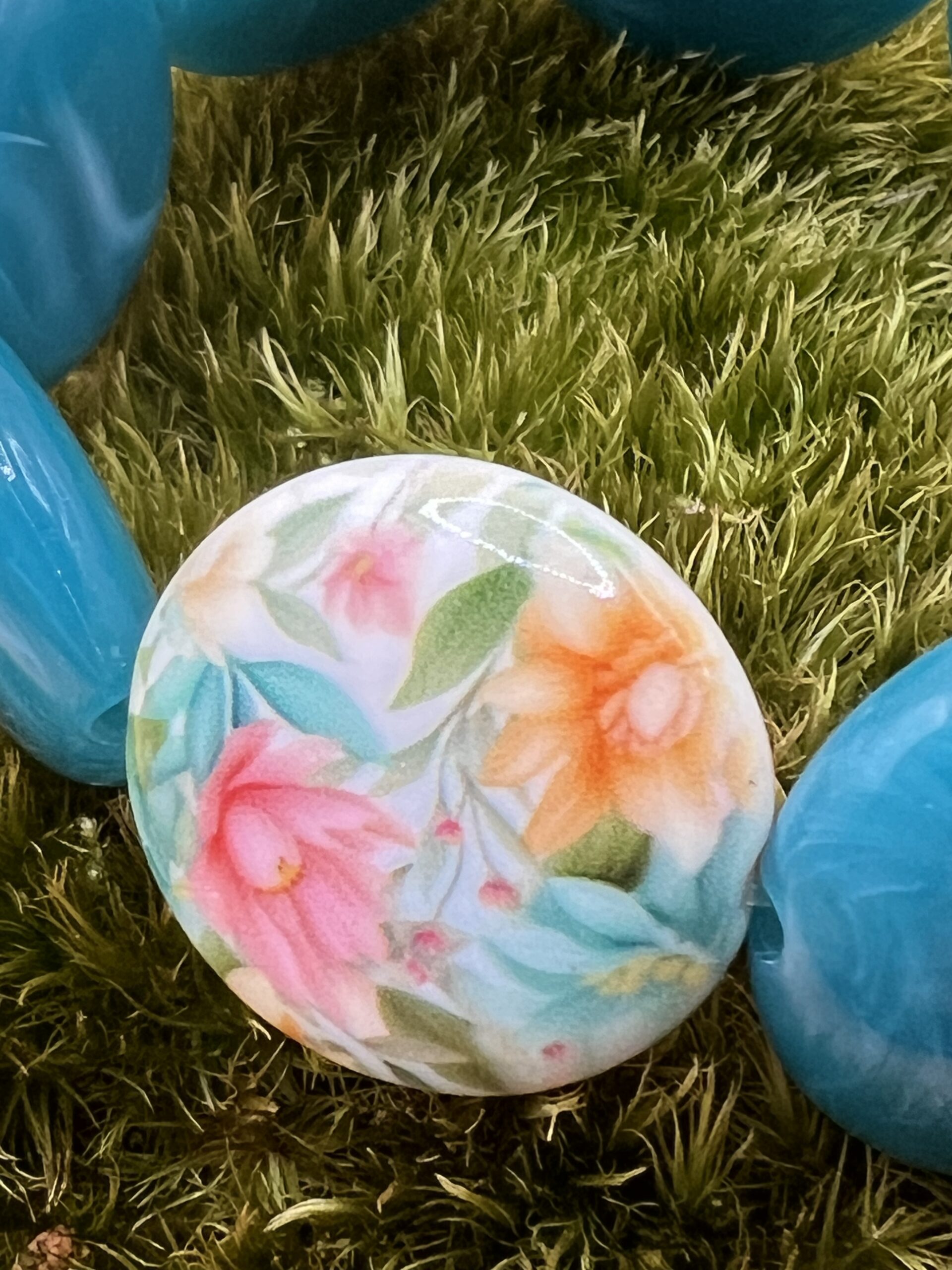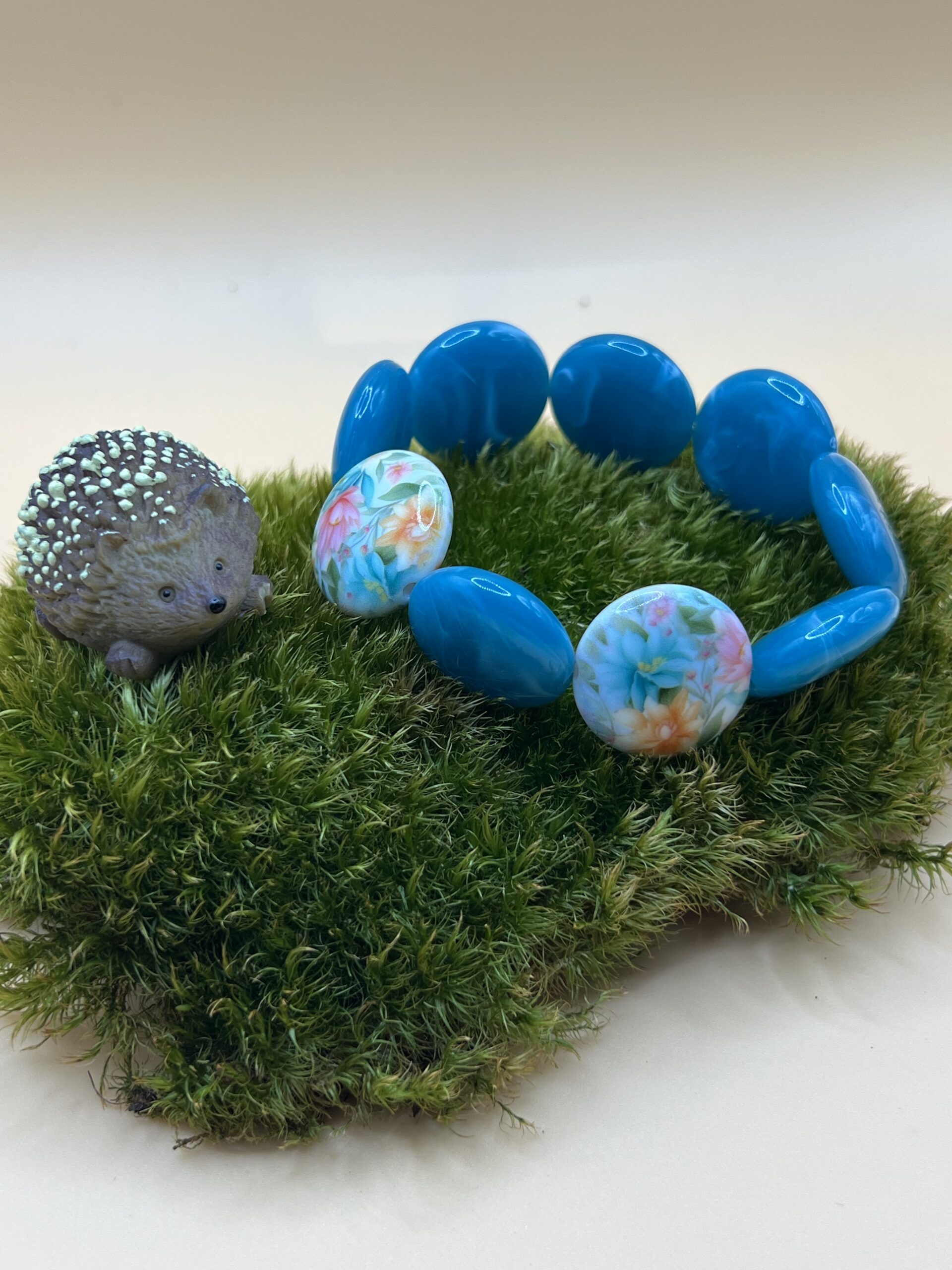 Ce Bracelet élastique est composé de perles aux teintes bleu profond, deux perles illustrées de motifs floraux délicats.