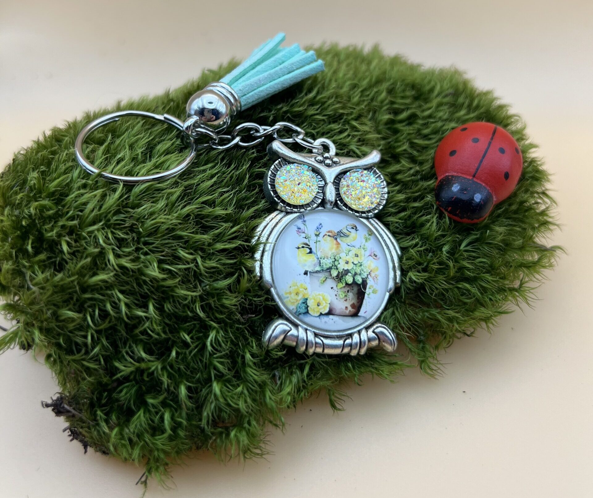 Un porte-clés au style vintage et poétique, mettant en scène une jolie chouette.